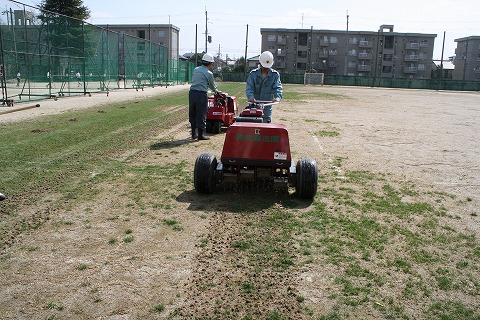 芝生化後初めてコアリングを行い、低い所にコアを敷き均しました