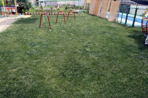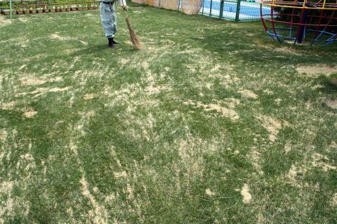芝が伸びすぎていたため、芝刈りして夏芝を播種