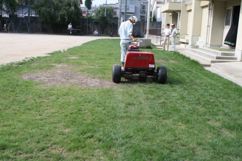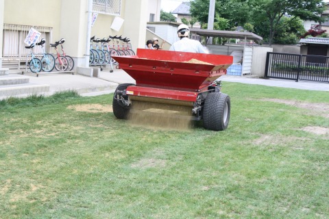 夏芝(バミューダグラス)を播き、目土を散布しました。(体育館側)