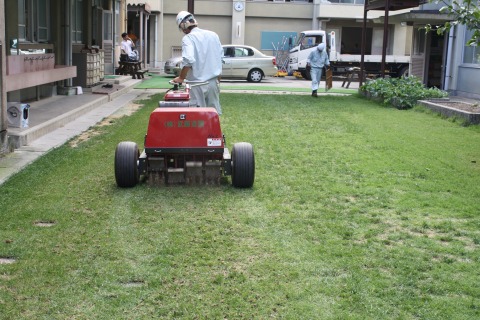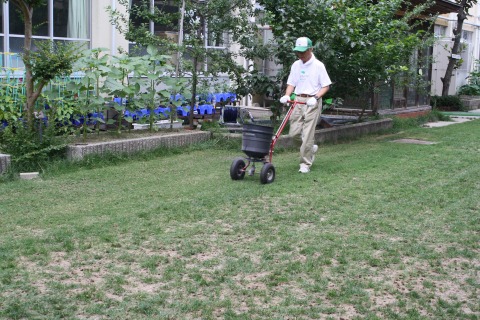 夏芝(バミューダグラス)を播き、目土を散布しました。(中庭)