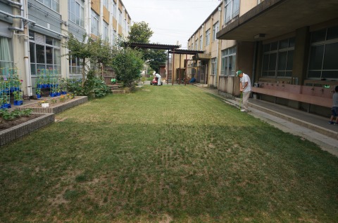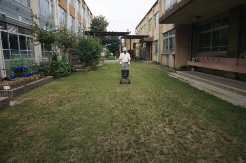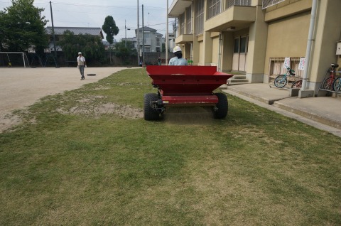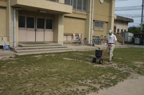 体育館側ではスパイキングの後、夏芝のタネを播きました。