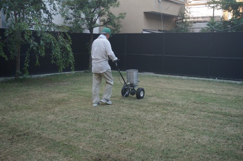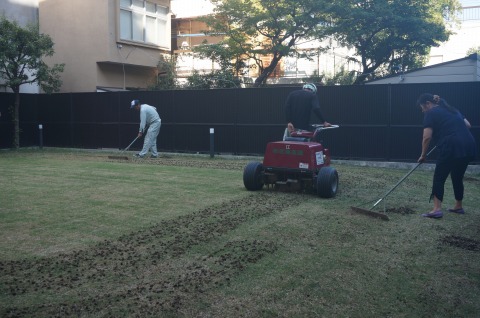 ライグラスを播き、目土を散布しました