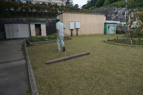 ブラッシングでタネを芝地に擦り込みました。