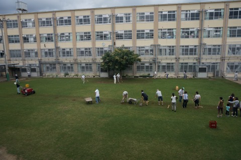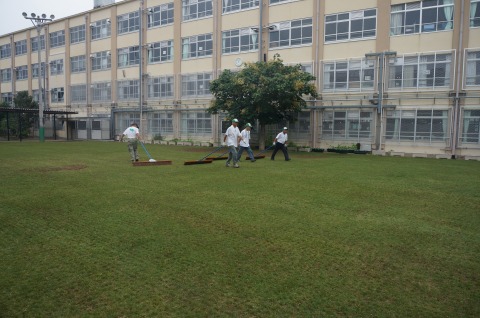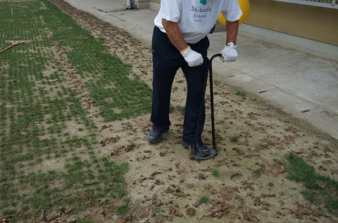 ブラッシングを行って、タネを芝地に擦り込みました。