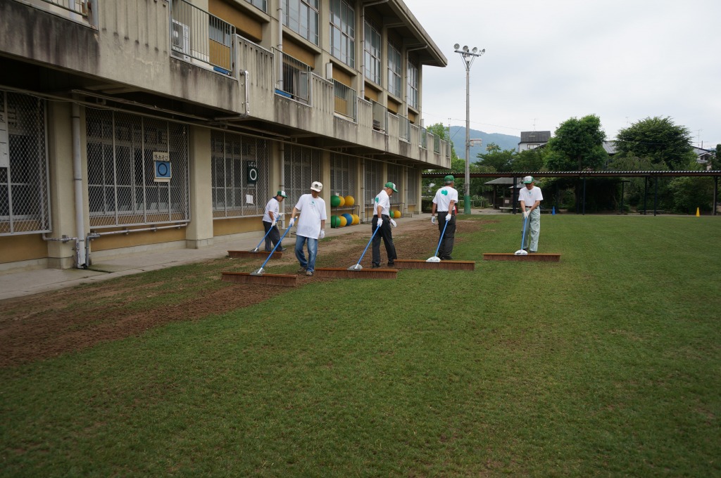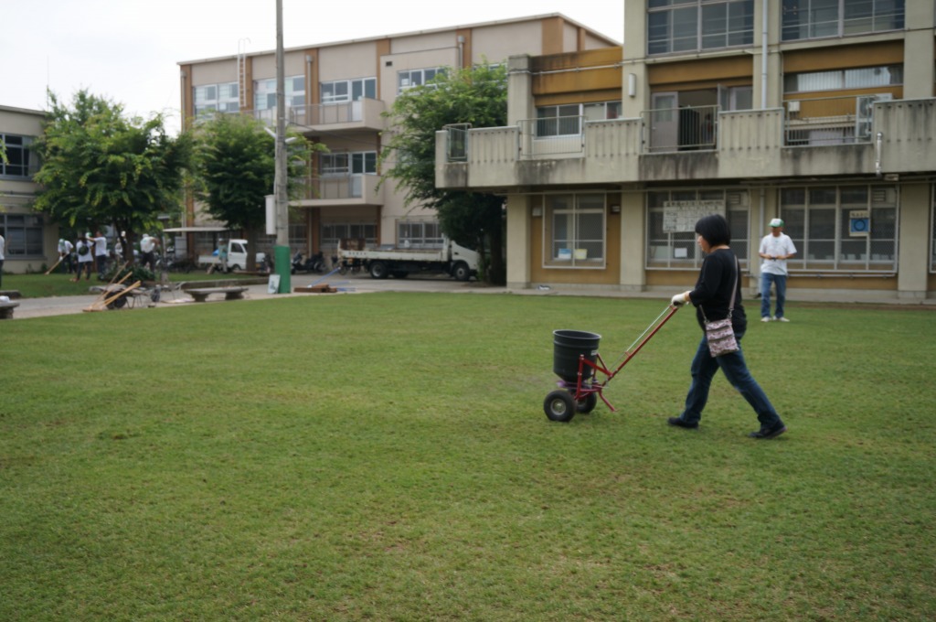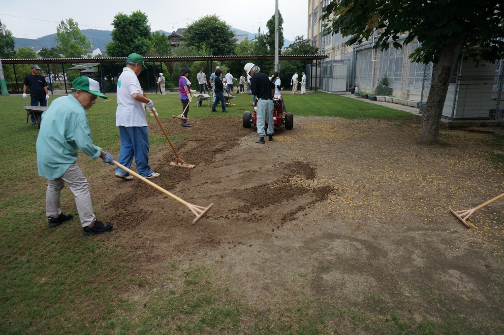 ブラッシングを行い、タネを芝地にすり込みました。