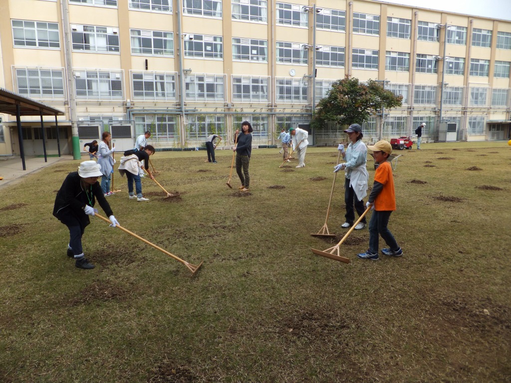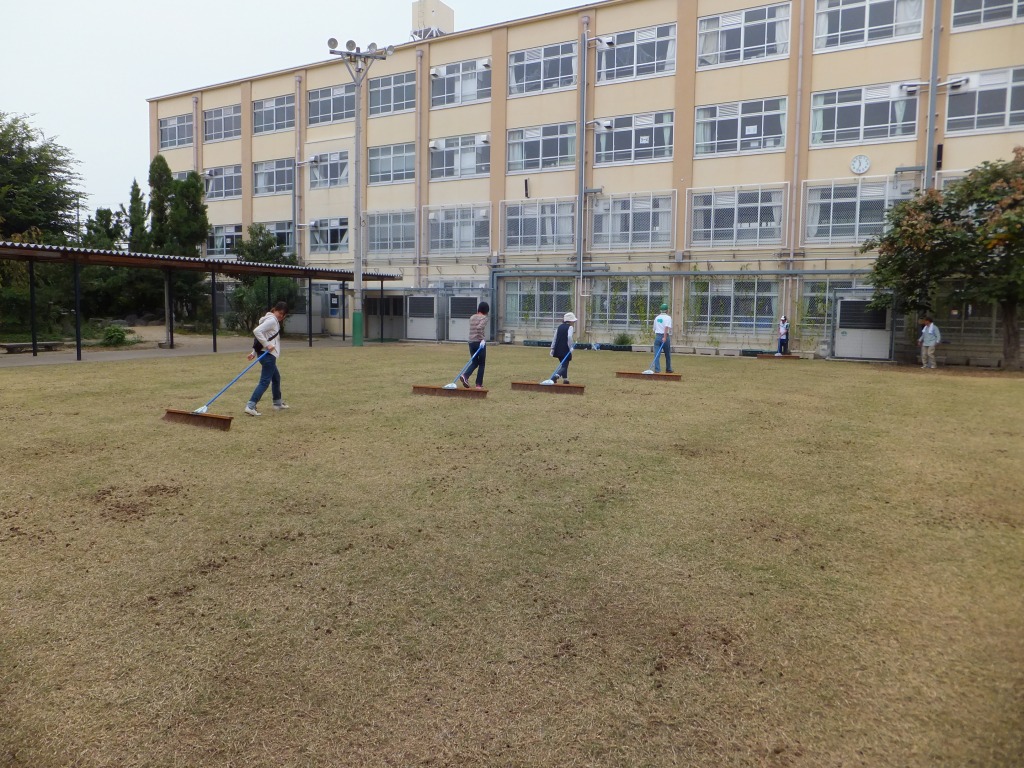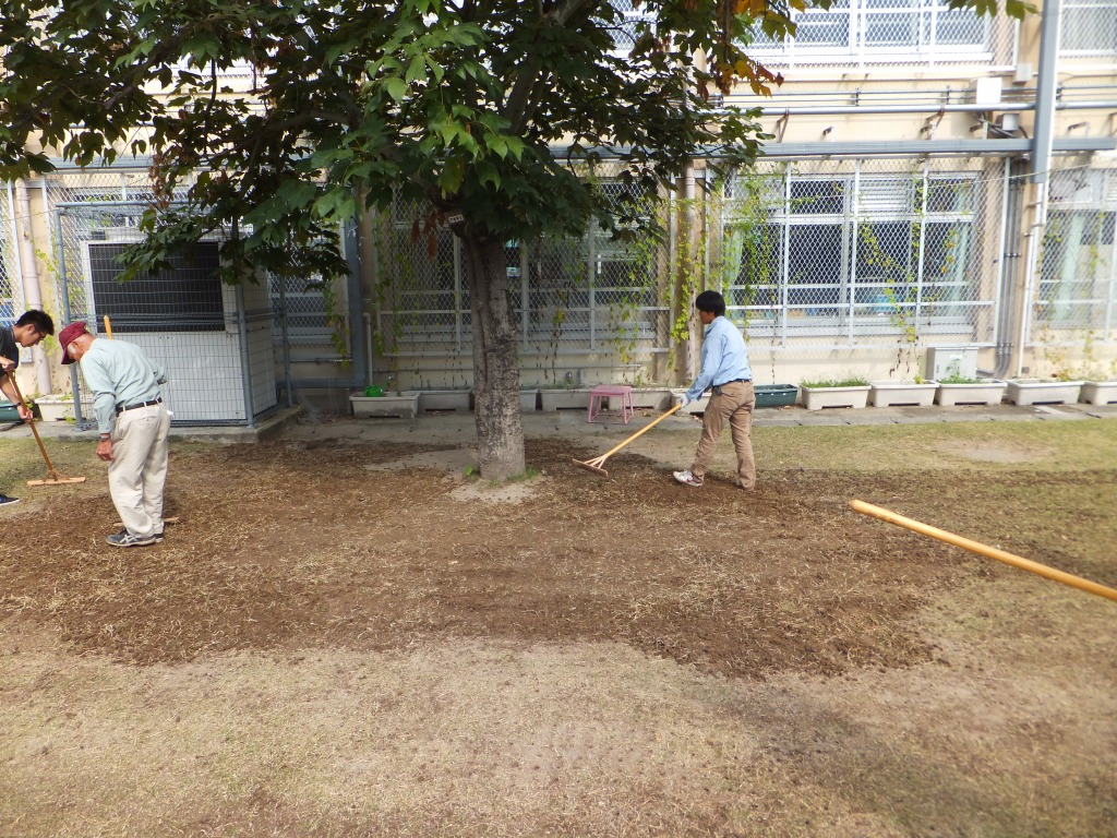 ブラッシングを行い、タネを芝地にすり込みました。