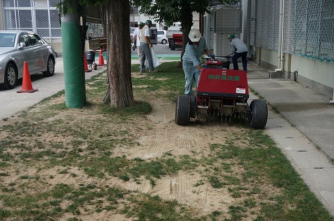 スパイキングを行って、夏芝(バミューダグラス)のタネ15g・uを播きました。