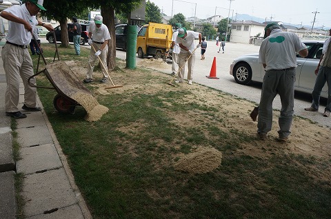 手作業で目土を散布しました。