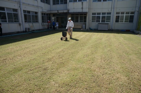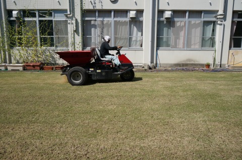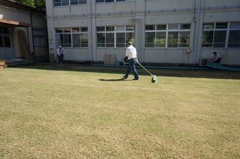 コアリングを行い、コアを収集せずに冬芝(ライグラス)を播きました。