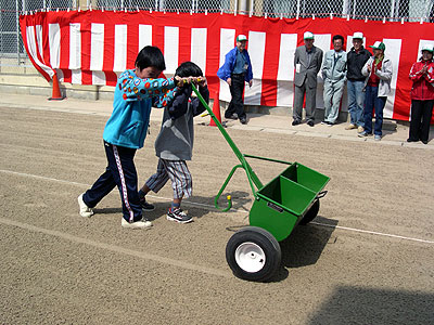 ドロップシーダー(手動種蒔き機)に興味津々の子どもたち