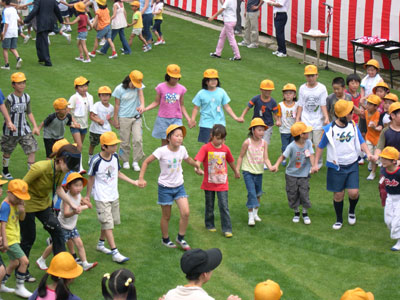 芝生完成を祝う全校フォークダンス