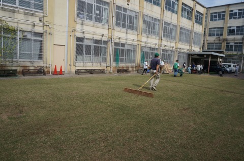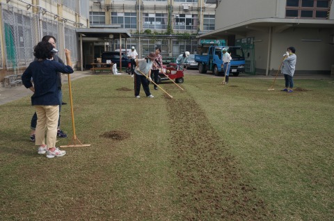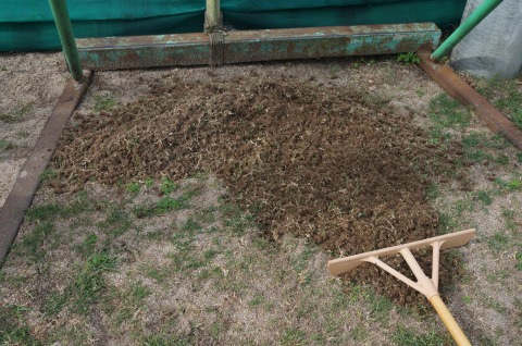 ブラッシングを行ってタネを芝地に擦り込みました。