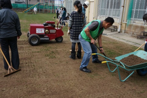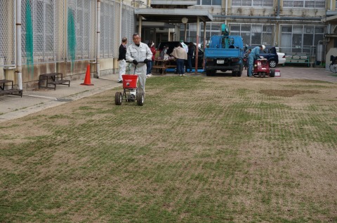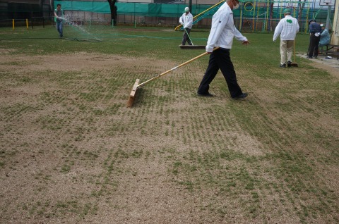 ブラッシングを行ってタネを芝地に擦り込みました。