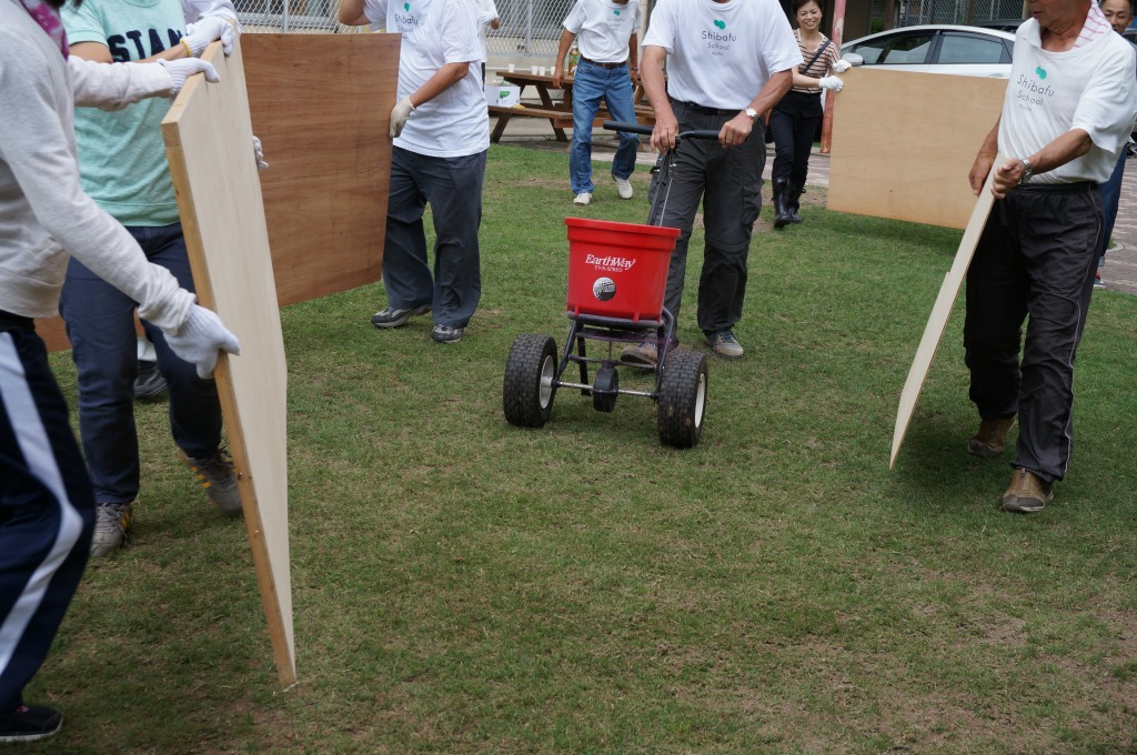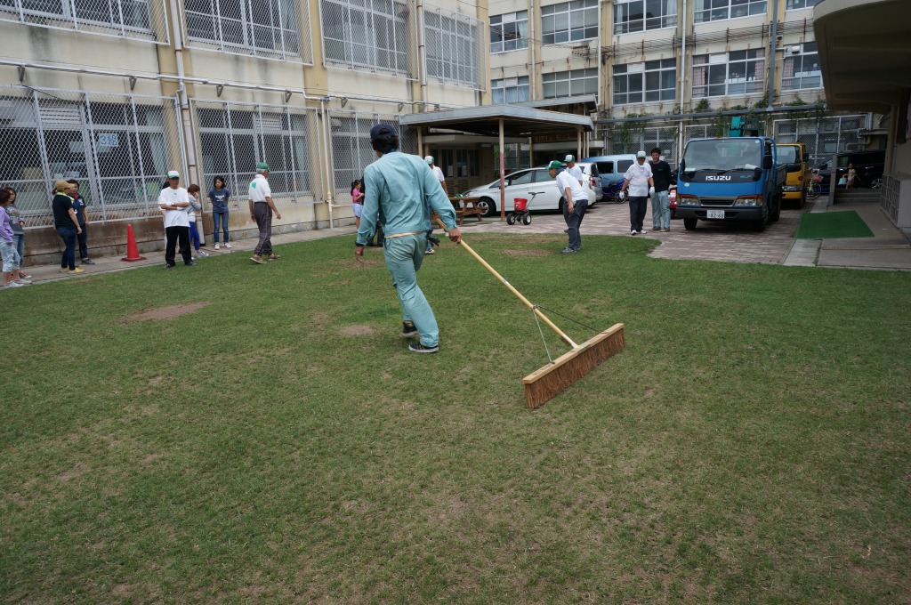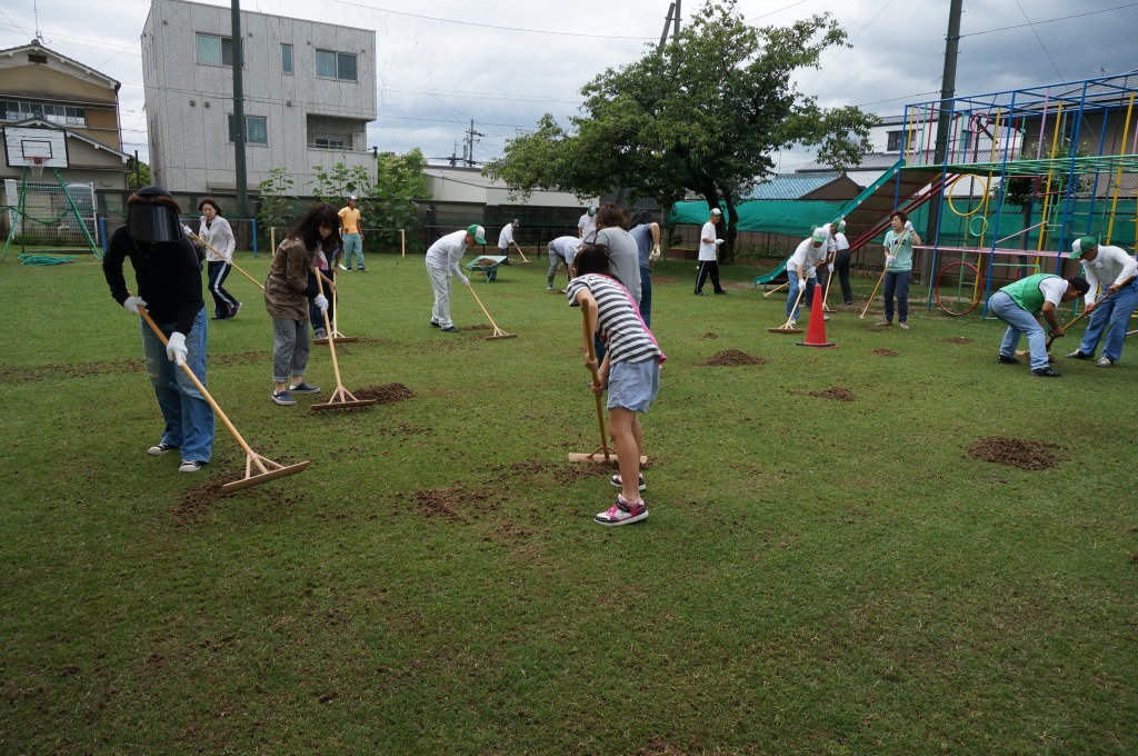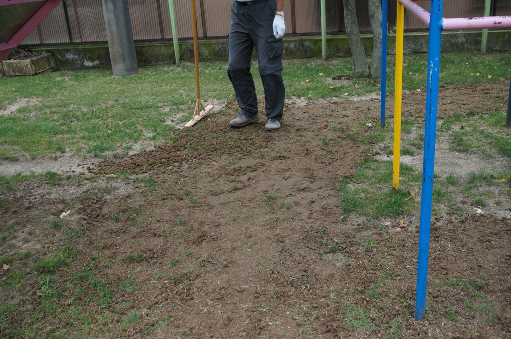 ブラッシングを行ってタネを芝地にすり込みました。