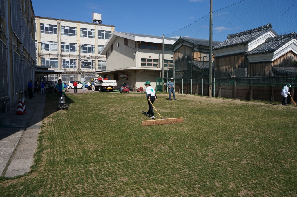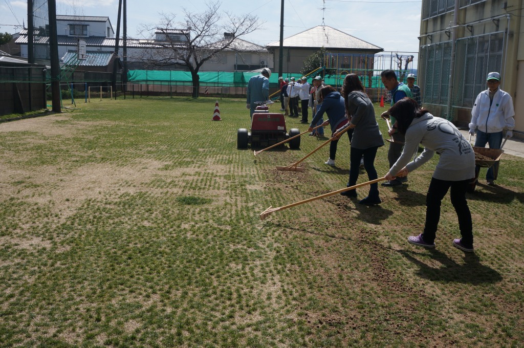 冬芝(ライグラス)のタネ45g,uを播き、ブラシで芝地にすり込みました。